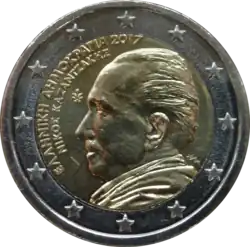 L'effigie de profil de Níkos Kazantzákis. À gauche, en arc de cercle la mention du pays émetteur ΕΛΛΗΝΙΚΗ ΔΗΜΟΚΡΑΤΙΑ suivi du millésime 2017 et le nom de l'écrivain ΝΙΚΟΣ ΚΑΖΑΝΤΖΑΚΗΣ. L'anneau externe de la pièce comporte les douze étoiles du drapeau européen.