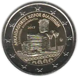 Les ruines de la basilique B sur le site archéologique de Philippes, au-dessus de motifs décoratifs inspirés d'une mosaïque antique. En haut, en arc de cercle, la légende ΑΡΧΑΙΟΛΟΓΙΚΟΣ ΦΙΛΙΠΠΩΝ (Site archéologique de Philippes) et la mention du pays émetteur ΕΛΛΗΝΙΚΗ ΔΗΜΟΚΡΑΤΙΑ. En haut, à gauche des ruines, le millésime 2017. L'anneau externe de la pièce comporte les douze étoiles du drapeau européen.