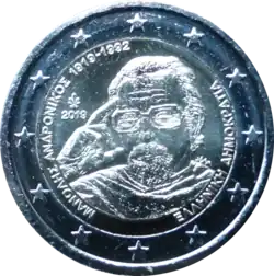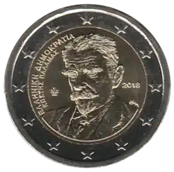Buste de Kostís Palamás. À gauche, la mention du pays émetteur ΕΛΛΗΝΙΚΗ ΔΗΜΟΚΡΑΤΙΑ et son nom ΚΩΣΤΗΣ ΠΑΛΑΜΑΣ. À droite, le millésime 2018. L'anneau externe de la pièce comporte les douze étoiles du drapeau européen.