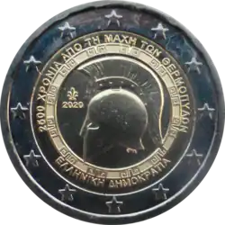 Casque grec antique entouré de la légende 2500 ΧΡΟΝΙΑ ΑΠΟ ΤΗ ΜΑΧΗ ΤΩΝ ΘΕΡΜΟΠΥΛΩΝ (2500 ans depuis la Bataille des Thermopyles) et de la mention du pays émetteur ΕΛΛΗΝΙΚΗ ΔΗΜΟΚΡΑΤΙΑ. À la hauteur du front, le millésime 2020. L'anneau externe de la pièce comporte les douze étoiles du drapeau européen.