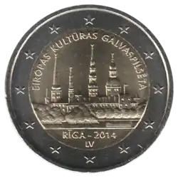 Vue de la ville de Riga et de son historique sous la légende EIROPAS KULTŪRAS GALVASPILSĒTA (Capitale européenne de la Culture) et au-dessus du nom de la ville RĪGA, du millésime 2014 et le code ISO du pays émetteur LV. L'anneau externe de la pièce comporte les douze étoiles du drapeau européen.