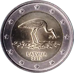 La représentation d'une cigogne noire debout sur son nid, au-dessus du nom du pays émetteur LATVIJA et du millésime 2015. L'anneau externe de la pièce comporte les douze étoiles du drapeau européen.