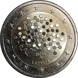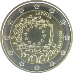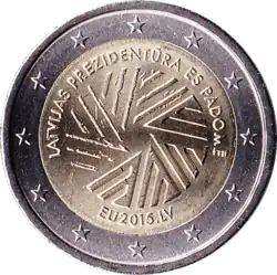 Le logo de la présidence lettonne du Conseil de l'Union européenne sous la légende LATVIJAS PREZIDENTŪRA ES PADOME (Présidence lettonne du Conseil de l'UE) et au-dessus de l'URL EU2015.LV. L'anneau externe de la pièce comporte les douze étoiles du drapeau européen.