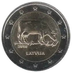Une vache brune lettonne en train de brouter. Sous les pattes postérieures, le millésime 2016. En bas, la mention du pays émetteur LATVIJA. L'anneau externe de la pièce comporte les douze étoiles du drapeau européen.