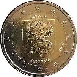 L'écusson de la région de Vidzeme au-dessus du nom de la région VIDZEME et en dessous de la mention du pays émetteur LATVIJA. À droite le millésime 2016. L'anneau externe de la pièce comporte les douze étoiles du drapeau européen.