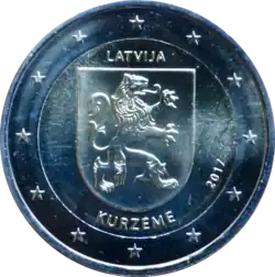 L'écusson de la région de Courlande au-dessus du nom de la région KURZEME et en dessous de la mention du pays émetteur LATVIJA. À droite, le millésime 2017. L'anneau externe de la pièce comporte les douze étoiles du drapeau européen.