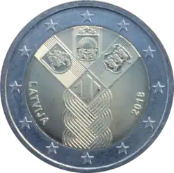 Une tresse composée de trois mèches. Chacune d'elles comporte en haut les écussons (de gauche à droite) de la Lituanie, la Lettonie et l'Estonie. Au centre le nombre 100 stylisé. En bas à gauche, le nom du pays émetteur LATVIJA. En bas à droite, le millésime 2018. L'anneau externe de la pièce comporte les douze étoiles du drapeau européen.