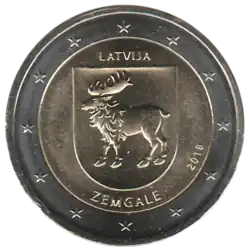 L'écusson de la région de Zemgale au-dessus du nom de la région ZEMGALE et en dessous de la mention du pays émetteur LATVIJA. À droite, le millésime 2018. L'anneau externe de la pièce comporte les douze étoiles du drapeau européen.