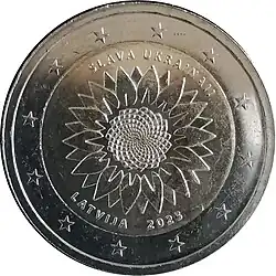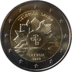 Soleil levant stylisé avec au centre les lettres B et L (pour Brīvā Latvija signifiant Lettonie libre). En haut, la légende UZLĒCOŠĀ SAULE (soleil levant). En bas, la mention du pays émetteur LATVIJA, au-dessus du millésime 2019. L'anneau externe de la pièce comporte les douze étoiles du drapeau européen.