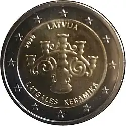 Chandelier en argile sous lequel est placée la légende LATGALES KERAMIKA. En haut, le millésime 2020 suivi de la mention du pays émetteur LATVIJA. L'anneau externe de la pièce comporte les douze étoiles du drapeau européen.