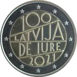 Trois lignes obliques dans lesquelles est noté le texte 100 LATVIJA DE IURE 2021 (100 Lettonie de jure 2021). Les lettres apparaissent dans différentes tailles. L'anneau externe de la pièce comporte les douze étoiles du drapeau européen.
