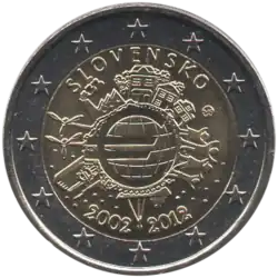 Tous les pays de la zone euro ont émis le 1er janvier une pièce commémorative de 2 € pour célébrer le 10e anniversaire de l'Union économique et monétaire. Le centre de la pièce illustre une silhouette humaine stylisée dont le bras gauche est prolongé par le symbole de l'euro. Le nom du pays émetteur SLOVENSKO apparaît dans la partie supérieure, tandis que l'indication 1999-2009 et l'acronyme HMÚ (pour Hospodárska a menová únia, Union économique et monétaire ou UEM) apparaissent dans la partie inférieure. L'anneau externe de la pièce représente les douze étoiles du drapeau européen. | ||||||