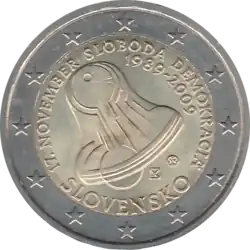 La représentation stylisée d'une cloche formée d'une série de clefs, en souvenir de la manifestation du 17 novembre 1989, où les citoyens marchèrent en agitant leurs trousseaux de clefs pour les faire sonner, ce qui marqua le début de la Révolution de velours. Autour du dessin, en haut, la légende 17 NOVEMBER SLOBODA - DEMOKRACIA (17 novembre liberté - démocratie) et les dates 1989-2009. En bas, l'indication du pays émetteur SLOVENSKO. L'anneau externe de la pièce comporte les douze étoiles du drapeau européen. | ||||||