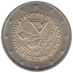 La carte des quatre pays du Groupe de Visegrád : la Pologne, la République tchèque, la Slovaquie et la Hongrie. La carte est complétée par l'abréviation stylisée V IV. Le nom du pays émetteur, SLOVENSKO, se trouve dans la partie inférieure droite, et le millésime 2011 dans la partie inférieure gauche de la pièce. Le dessin est entouré d'une légende bilingue, VYŠEHRADSKÁ SKUPINA • VISEGRAD GROUP (Groupe de Visegrád), et de la date de la fondation du groupe de Visegrád, 15.2.1991. L'anneau externe de la pièce comporte les douze étoiles du drapeau européen. | ||||||