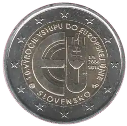 Les lettres EÚ (pour Európska únia, Union européenne ou UE) stylisées avec l'écusson slovaque apposé sur le Ú. À droite, les dates, en trois lignes, 1.5.2004 2014. Tout autour la légende 10.VÝROČIE VSTUPU DO EURÓPSKEJ ÚNIE et la mention du pays émetteur SLOVENSKO. L'anneau externe de la pièce comporte les douze étoiles du drapeau européen. | ||||||