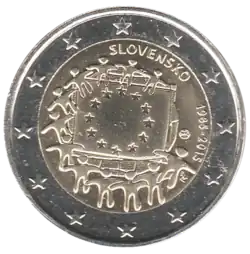 Le drapeau européen dessiné grossièrement, entouré par douze bonshommes stylisés. En haut à droite, le nom du pays émetteur SLOVENSKO suivi des années 1985-2015. L'anneau externe de la pièce comporte les douze étoiles du drapeau européen. | ||||||