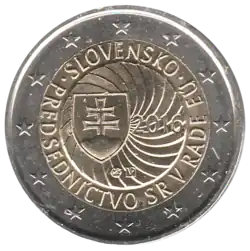 - ↑ Results of the public competition for the design of the national side of a €2 commemorative coin marking Slovakia's first presidency of the Council of the European Union. Sur le site officiel de la Národná banka Slovenska (consulté le 4 octobre 2015).