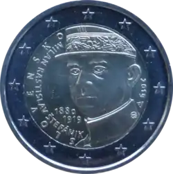 - ↑ (en) « Results of the public competition for the design of the national side of a €2 commemorative coin featuring the 100th anniversary of the death of Milan Rastislav Štefánik », sur le site officiel de la Banque nationale de Slovaquie (consulté le ).