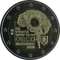 - ↑ (sk) « Výsledky verejnej anonymnej súťaže na výtvarný návrh národnej strany pamätnej euromince v nominálnej hodnote 2 eurá k 20. výročiu vstupu Slovenskej republiky do Organizácie pre hospodársku spoluprácu a rozvoj (OECD) », sur le site de la Banque nationale de Slovaquie (consulté le ).