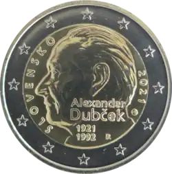 Portrait de profil gauche d'Alexander Dubček. Le nom du pays émetteur SLOVENSKO est inscrit sur le bord gauche, l'année d'émission 2021 sur le bord droit. Dans la partie inférieure du portrait se trouve son nom, Alexander Dubček, et ses dates de naissance 1921 et de mort 1992. L'anneau extérieur de la pièce porte les 12 étoiles de l'Union européenne. | ||||||