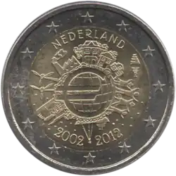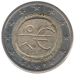 Tous les pays de la zone euro ont émis le 1er janvier une pièce commémorative de 2 € pour célébrer le 10e anniversaire de l'Union économique et monétaire. Le centre de la pièce illustre une silhouette humaine stylisée dont le bras gauche est prolongé par le symbole de l'euro. Le nom du pays émetteur NEDERLAND apparaît dans la partie supérieure, tandis que l'indication 1999-2009 et l'acronyme EMU (pour Economische en Monetaire Unie, Union économique et monétaire ou UEM) apparaissent dans la partie inférieure. L'anneau externe de la pièce représente les douze étoiles du drapeau européen. | ||||||