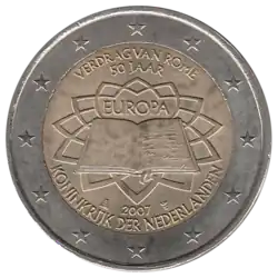 Tous les pays de la zone euro, dont les Pays-Bas, ont émis le 25 mars 2007 une pièce commémorative de 2 € pour célébrer le 50e anniversaire du traité de Rome. Le centre de la pièce représente le traité signé par les six États membres fondateurs devant un arrière-plan évoquant le dallage, dessiné par Michel-Ange, de la place du Capitole, à Rome, où le traité a été signé le 25 mars 1957. Le mot EUROPA (Europe) figure au-dessus du livre. La légende VERDRAG VAN ROME (Traité de Rome) et 50 JAAR (50 ans) est inscrite au-dessus du dessin. Le millésime 2007 et le nom du pays émetteur KONINKRIJK DER NEDERLANDEN sont inscrits sous le dessin. L'anneau externe de la pièce comporte les douze étoiles du drapeau européen. | ||||||