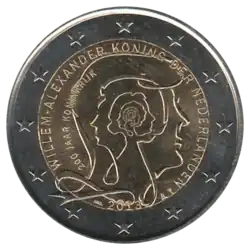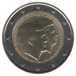 - Pièces de 1 et 2 euros : L'effigie de Willem-Alexander, Roi des Pays-Bas, tournée vers la droite. À droite, un triple double bandeau traverse verticalement la pièce avec, le millésime et, en deux lignes, la légende Willem-Alexander Koning der Nederlanden (Willem-Alexander Roi des Pays-Bas). Le tout est entouré des 12 étoiles du drapeau européen sur l'anneau extérieur.