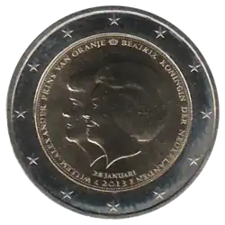 Le double portrait de la Reine Beatrix et du Prince Willem-Alexander. Le tout est entouré par la légende WILLEM-ALEXANDER PRINS VAN ORANJE (Willem-Alexander Prince d'Orange), BEATRIX KONINGIN DER NEDERLANDEN (Beatrix Reine des Pays-Bas) et le millésime 2013 (en bas, au centre). La date de l'annonce de l'abdication est indiquée au centre sous les portraits : 28 januari (28 janvier). L'anneau extérieur de la pièce comporte les douze étoiles du drapeau européen. | ||||||