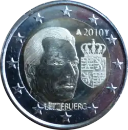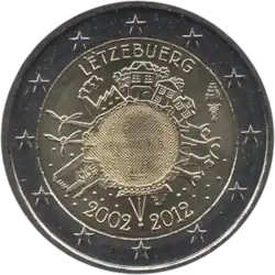 Tous les pays de la zone euro ont émis le 1er janvier une pièce commémorative de 2 € pour célébrer le 10eanniversaire de l'Union économique et monétaire. Le centre de la pièce illustre, en filigrane, alternativement une silhouette humaine stylisée dont le bras gauche est prolongé par le symbole de l'euro ou l'effigie du Grand-Duc Henri[N 1]. Le nom du pays émetteur LËTZEBUERG apparaît dans la partie supérieure, tandis que l'indication 1999-2009 et l'acronyme UEM (pour Union économique et monétaire) apparaissent dans la partie inférieure. L'anneau externe de la pièce représente les douze étoiles du drapeau européen.