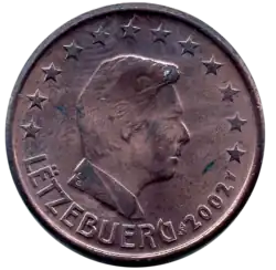 Comme le veut l'article 39 de la Constitution du Luxembourg, c'est le grand-duc qui a le pouvoir de battre la monnaie. Le grand-duc Jean a choisi de faire représenter son héritier, Henri, sur les pièces en euro[2]. Celui-ci deviendra grand-duc, en 2000, avant l'introduction des pièces en euro. La loi luxembourgeoise exige en effet que toutes les pièces de monnaie luxembourgeoises portent l'effigie du grand-duc régnant au moment de leur mise en circulation.