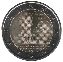 Effigies du Grand-Duc Henri et de la Grande-Duchesse María Teresa au-dessus de la légende, en deux lignes, 15eanniversaire de l'accession au trône de S.A.R. le Grand-Duc. En haut, à droite, le nom du pays émetteur Luxembourg entre l'année d'accession au trône d'Henri, 2000, et le millésime 2015. L'anneau externe de la pièce comporte les douze étoiles du drapeau européen.