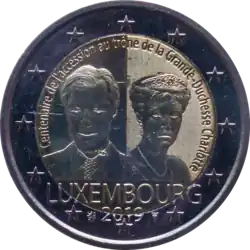 Côte à côte, les effigies de face du Grand-Duc Henri et de la Grande-Duchesse Charlotte. La légende Centenaire de l'accession au trône de la Grande-Duchesse Charlotte entoure une grande partie des deux effigies. En bas, la mention du pays émetteur LUXEMBOURG au-dessus du millésime 2019. L'anneau externe de la pièce comporte les douze étoiles du drapeau européen.