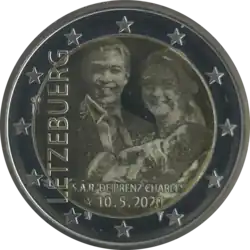 Le Prince Guillaume et la Princesse Stéphanie tenant le Prince Charles, bébé, dans les bras. En bas, la légende S.A.R. DE PRËNZ CHARLES (S.A.R. le Prince Charles) au-dessus de sa date de naissance 10.05.2020 précédé d'une étoile. À gauche, en vertical, la mention du pays émetteur LËTZBUERG. À gauche du U, le monogramme couronné du Grand-Duc Henri. L'anneau externe de la pièce comporte les douze étoiles du drapeau européen.
