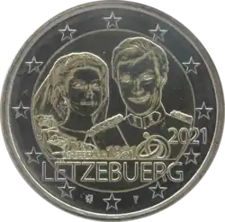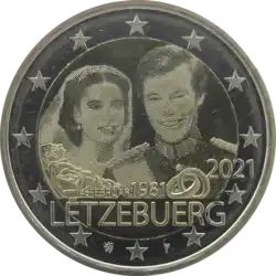 Portraits de la Grande-Duchesse María Teresa (à gauche) et du Grand-Duc Henri (à droite). Sous les effigies, la date du mariage 14. FEBRUAR 1981 (14 février 1981) et deux alliances entrelacées, suivies du millésime 2021. La mention du pays émetteur LËTZEBUERG est inscrite au-dessous. L’anneau extérieur de la pièce comporte les douze étoiles du drapeau européen.