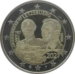 Portraits du Grand-Duc Jean (en buste, à gauche) et du Grand-Duc Henri (à droite). Les noms des deux Grands-Ducs, JEAN et HENRI sont indiqués verticalement à côté de chaque effigie, ainsi que l’année de naissance 1921 du Grand-Duc Jean. Sous les portraits figure une représentation stylisée de la ville de Luxembourg avec le pont Adolphe. En haut à gauche en arc de cercle, la mention GROUSSHERZOGE VU LËTZEBUERG (Grand-Duc de Luxembourg) qui désigne également le pays d’émission (le mot LËTZEBUERG est de taille plus grande). L’année d’émission, 2021, apparaît sous le pont.