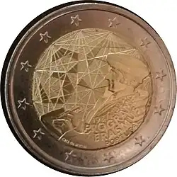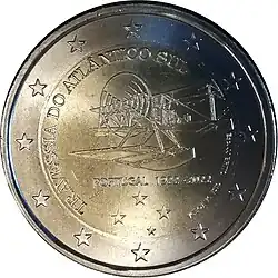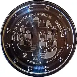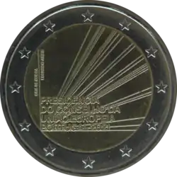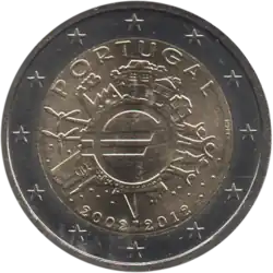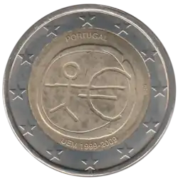 Tous les pays de la zone euro ont émis le 1er janvier une pièce commémorative de 2 € pour célébrer le 10eanniversaire de l'Union économique et monétaire. Le centre de la pièce illustre une silhouette humaine stylisée dont le bras gauche est prolongé par le symbole de l'euro. Le nom du pays émetteur PORTUGAL apparaît dans la partie supérieure, tandis que l'indication 1999-2009 et l'acronyme UEM (pour União Económica e Monetária, Union économique et monétaire) apparaissent dans la partie inférieure. L'anneau externe de la pièce représente les douze étoiles du drapeau européen.