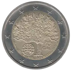 La représentation d'un chêne-liège (Quercus suber) sous les branches duquel on trouve les armoiries portugaises, du côté gauche; du côté droit, le mot PORTUGAL est écrit sur trois lignes. La légende 2007 PRESIDÊNCIA DO CONSELHO DA UE (2007 Présidence du Conseil de l'UE) est inscrite en demi-cercle dans le bas près des armoiries. L'anneau externe de la pièce comporte les douze étoiles du drapeau européen.