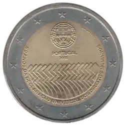 Les armoiries portugaises dans la partie supérieure, au-dessus du nom du pays émetteur PORTUGAL, le millésime 2008 et un dessin géométrique dans la moitié inférieure. La légende 60 ANOS DA DECLARAÇÃO UNIVERSAL DOS DIREITOS HUMANOS (60 ans de la déclaration universelle des droits de l'homme) est inscrite le long des deux tiers inférieurs du noyau interne. L'anneau externe de la pièce comporte les douze étoiles du drapeau européen.