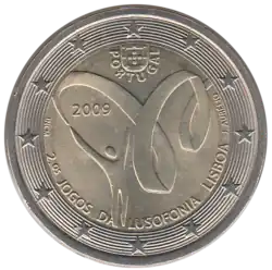 Un gymnaste avec un ruban. En haut, l'écusson du Portugal est situé dans un demi-cercle formé par l'indication du pays émetteur PORTUGAL. En bas, en demi-cercle, la légende 2. os JOGOS DA LUSOFONIA LISBOA (2e Jeux de la Lusophonie Lisbonne). Dans une boucle du ruban, à gauche, le millésime 2009. L'anneau externe de la pièce comporte les douze étoiles du drapeau européen, sur fond de lignes concentriques.