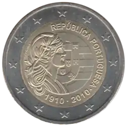 Au centre, les armoiries portugaises et l'allégorie de la république, República, deux des symboles les plus représentatifs de la République portugaise, autour desquelles figurent le nom du pays émetteur REPÚBLICA PORTUGUESA et les années 1910-2010. L'anneau externe de la pièce comporte les douze étoiles du drapeau européen.