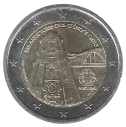 Vue depuis le bas de La Tour des Clercs, à Porto, à gauche du Pont Dom-Luís et de l'écusson du Portugal, en dessous duquel est indiqué le nom du pays émetteur PORTUGAL. En haut la légende 250 ANOS TORRE DOS CLÉRIGOS (250 ans Tour des Clercs) suivie du millésime 2013. L'anneau externe de la pièce comporte les douze étoiles du drapeau européen.