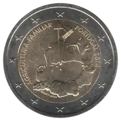La représentation d'un champ avec différents outils et produits agricoles (un poulet, des citrouilles, un panier de pommes de terre et d'autres légumes et fleurs). À gauche, la légende AGRICULTURA FAMILIAR (agriculture familiale). À droite, la mention du pays émetteur PORTUGAL et le millésime 2014. L'anneau externe de la pièce comporte les douze étoiles du drapeau européen.