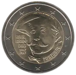 L'effigie de Raúl Brandão portant un nœud papillon et un chapeau et tournée vers la gauche. À gauche, son nom en trois lignes RAUL BRAN-DAO au-dessus des années 1867 et 2017, l'une au-dessus de l'autre. Dans son cou, la mention du pays émetteur PORTUGAL. L'anneau externe de la pièce comporte les douze étoiles du drapeau européen.