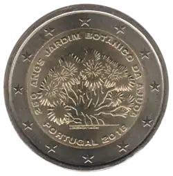 Représentation d'un très ancien dracaena, symbole du jardin botanique. En haut, la légende 250 ANOS JARDIM BOTÂNICO DA AJUDA. En bas, la mention du pays émetteur PORTUGAL suivie du millésime 2018. L'anneau externe de la pièce comporte les douze étoiles du drapeau européen.