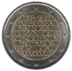 Texte typographique en majuscules en 8 lignes 1768-2018 IMPRENSA NACIONAL DUZENTOS E CINQUENTA 250 ANOS PORTUGAL MMXVIII (1768-2018 Imprimerie nationale deux cent cinquante 250 ans Portugal MMXVIII) exposés comme les livres d'une bibliothèque. L'anneau externe de la pièce comporte les douze étoiles du drapeau européen.