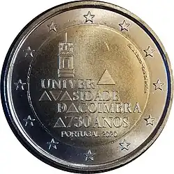 Sur 4 lignes, le texte UNIVERSIDADE DE COIMBRA 730 ANOS (Université de Coimbra 730 ans) dans lequel on retrouve 6 triangles, symbolisant les toits de l'université. Au-dessus, la tour de l'université. En bas, la mention du pays émetteur PORTUGAL et le millésime 2020. L'anneau externe de la pièce comporte les douze étoiles du drapeau européen.