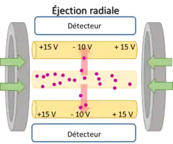 - Avec le piège ionique linéaire, il est possible d’effectuer deux types d’expulsion, contrairement à la trappe trois dimensions qui expulse les ions exclusivement sur l’axe z. L’expulsion radiale permet l’utilisation de deux détecteurs distincts, tandis que le mode axial est restreint à un seul détecteur.