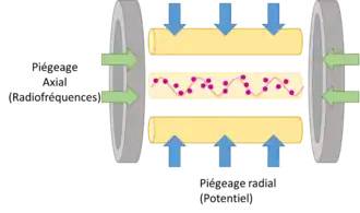 Plusieurs instruments analytiques modernes utilisent des dispositifs de stockage d’ions. Ces instruments permettent d’accumuler, stocker et éjecter des paquets d’ions comme souhaité. Un de ces appareils qui est important est le piège à ions linéaires, ou LIT (linear ion trap). Le principe de cet analyseur de masse consiste en un faisceau continu d’ions qui est introduit dans le LIT pour les piéger, les stocker et éventuellement les acheminer vers un ou des détecteurs, avec l’aide d’une éjection radiale ou axiale selon le mode choisi. Après l’éjection, les ions peuvent également être transmis jusqu’à un autre appareil qui sépare les ions en fonction de leur ratio masse sur charge (m/z)[4]. Lorsque les ions sont introduits dans ce type de piège, ils ne peuvent pas quitter axialement le LIT puisque des radio-fréquences sont appliquées aux extrémités. Les ions ne peuvent également pas quitter radialement le LIT puisqu’un potentiel de trappage est appliqué. De cette façon, les ions peuvent être donc piégés dans un temps voulu.