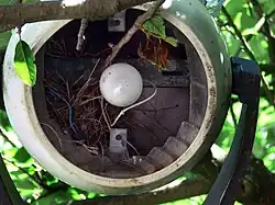 Nid d'oiseau à l'intérieur d'un luminaire (Lille, citadelle, 2010).