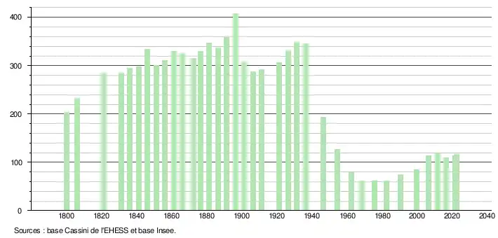 L'évolution du nombre d'habitants est connue à travers les recensements de la population effectués dans la commune depuis 1800. Pour les communes de moins de 10 000 habitants, une enquête de recensement portant sur toute la population est réalisée tous les cinq ans, les populations de référence des années intermédiaires étant quant à elles estimées par interpolation ou extrapolation[16]. Pour la commune, le premier recensement exhaustif entrant dans le cadre du nouveau dispositif a été réalisé en 2006[17].